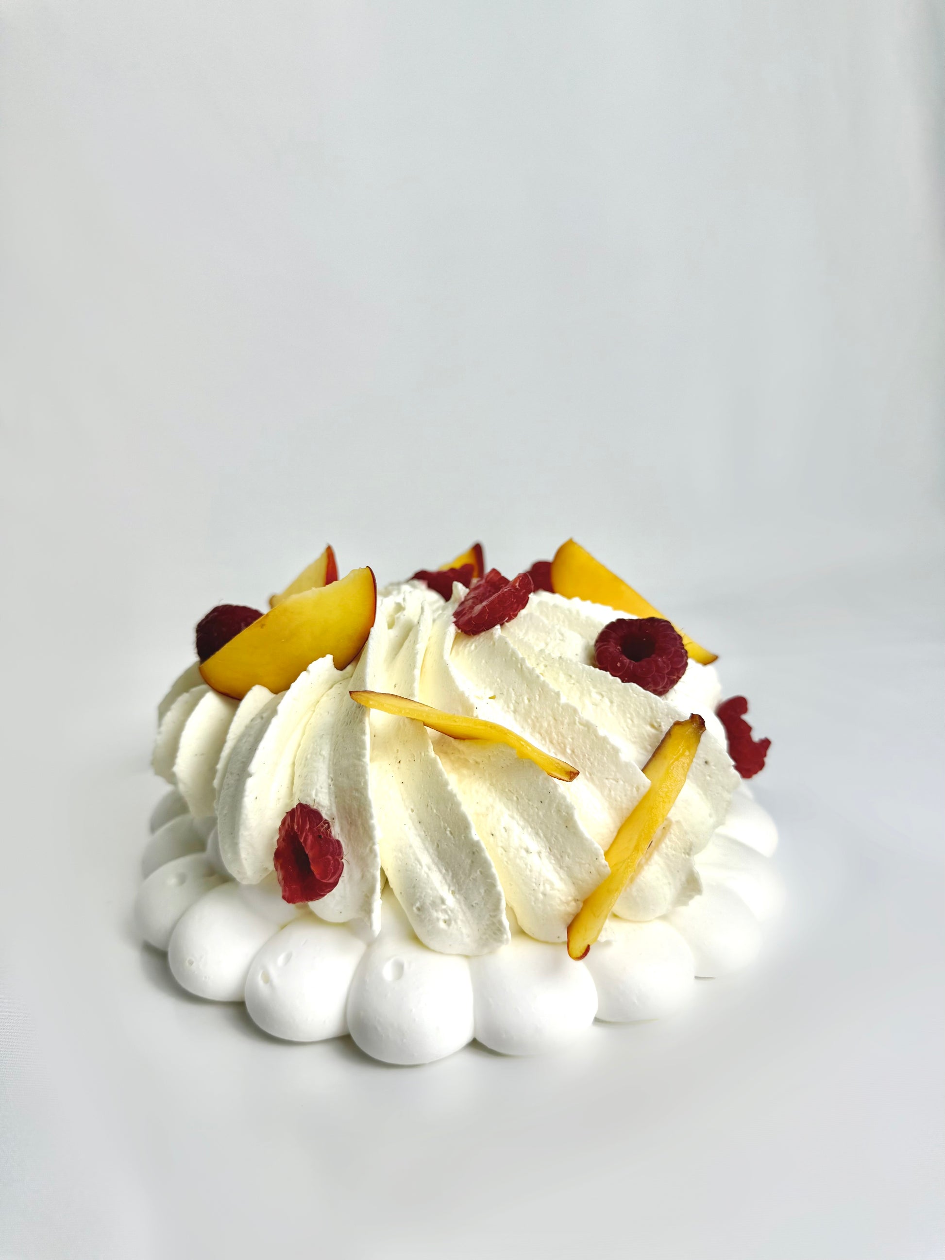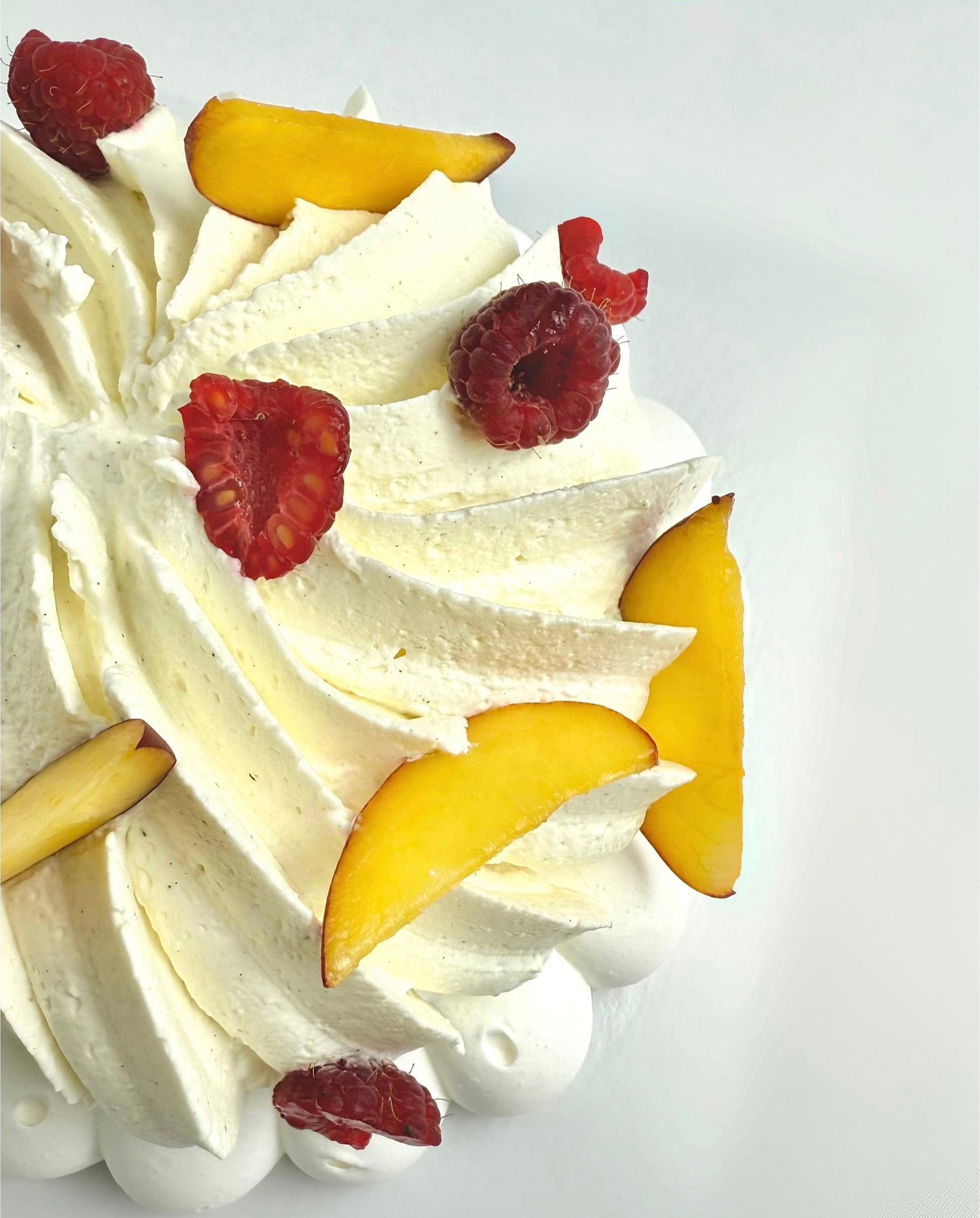 Léger comme un nuage, doux comme l’été… Paola est une pavlova délicate et ensoleillée, qui marie la tendresse de la pêche jaune à la vivacité acidulée de la framboise. Sa meringue craquante à l’extérieur, fondante à cœur, accueille un nuage de chantilly vanillée, surmonté de fruits frais soigneusement disposés, comme un bouquet. Chaque bouchée est une explosion de fraîcheur, entre douceur fruitée, croquant aérien et onctuosité parfumée.